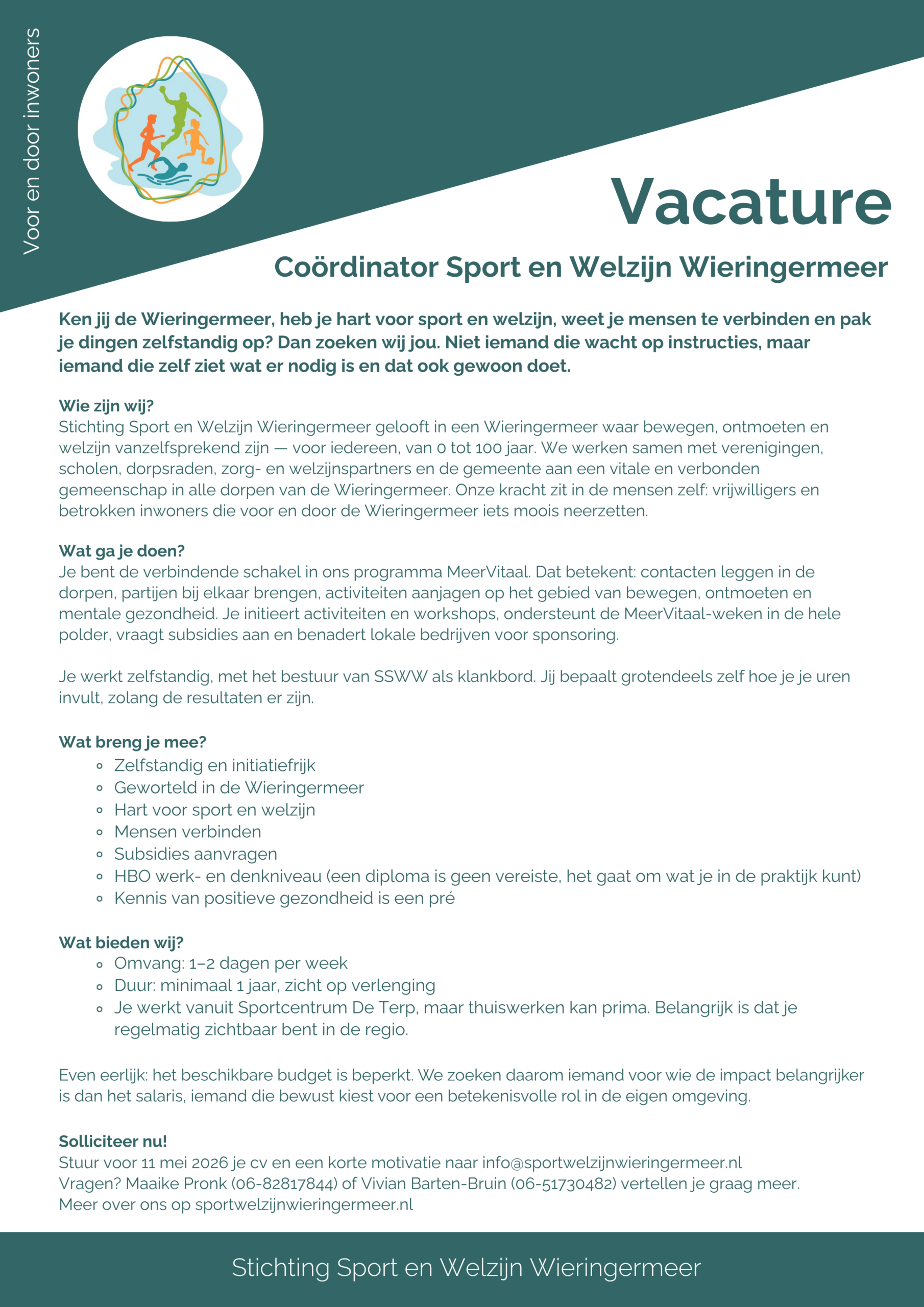 Stichting Sport en Welzijn Wieringermeer (SSWW) zet zich in voor het bevorderen van sport, welzijn en ontmoeten, voor iedereen van 0 tot 100 jaar in de Wieringermeer. Voor en door inwoners, met een groot lokaal netwerk en iedereen die zich inzet voor onze stichting doet dit hoofdzakelijk op vrijwillige basis.